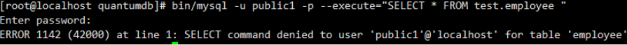 mysql -u public1 -p --execute="SELECT * FROM protected.employee where security_label !='UNCLASSIFIED'"