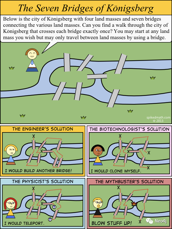 但 Euler 毕竟是数学家,反手就解决了这个问题,证明了没有方法能够一遍不重复地走完这七座桥,还发表了论文。