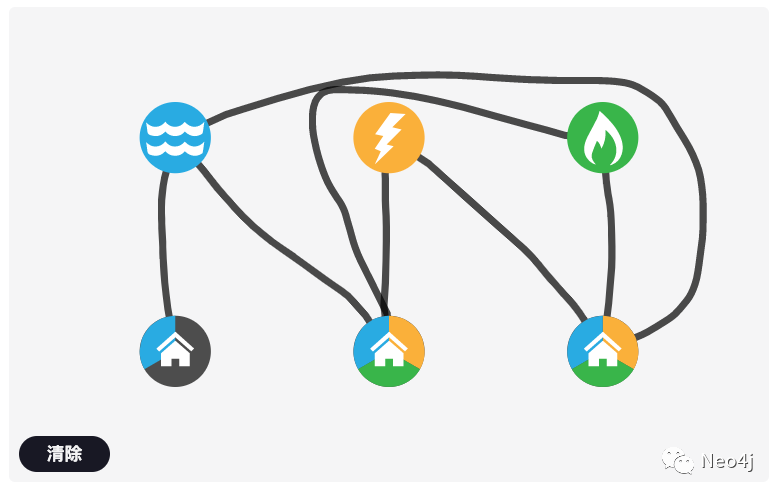 在一个小村庄里,有三间房屋和三座生产水、电和煤气的公用设施。我们必须将每个房屋连接到每个公用设施,但由于村庄的布局,不同的管道和电缆不允许交叉。