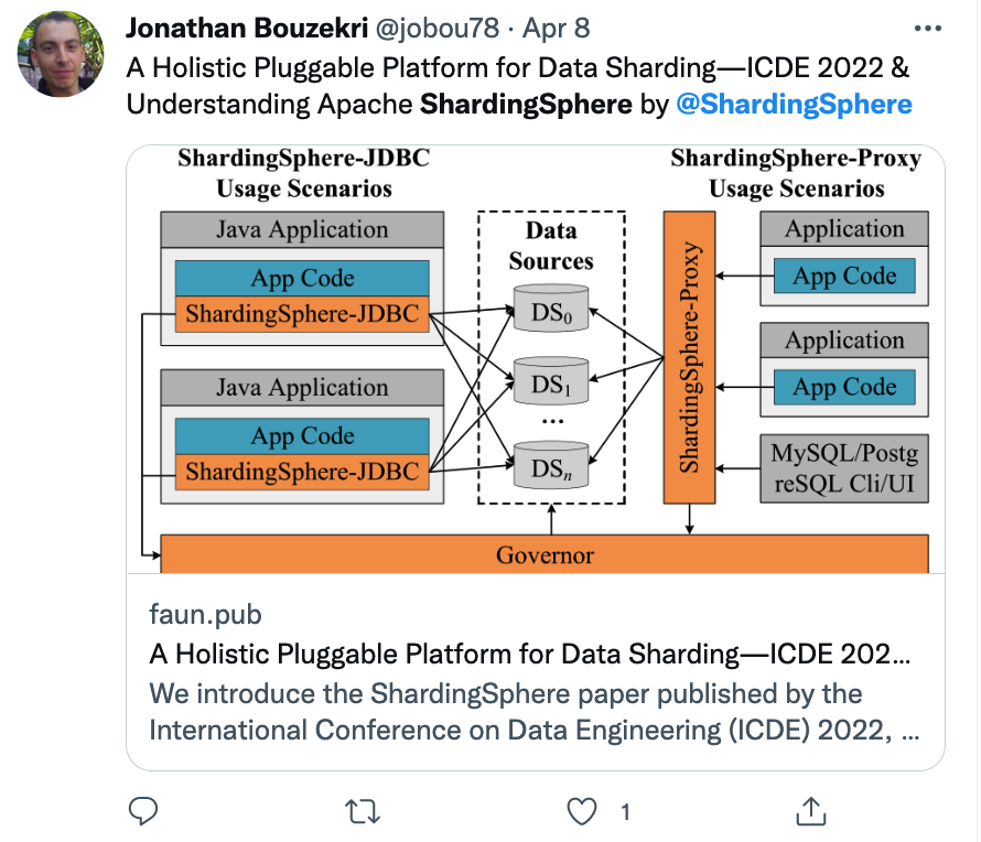 由重庆大学和 SphereEx 实验室合作发表在 CCF A 类数据库顶级期刊会议 ICDE 2022 上的论文解读文章 “A Holistic Pluggable Platform for Data Sharding — ICDE 2022 & Understanding Apache ShardingSphere” 在被 Medium 平台上最大的 DevOps 媒体 FAUN Publication 收录后,在 Twitter 上许多开发者积极转发该文。