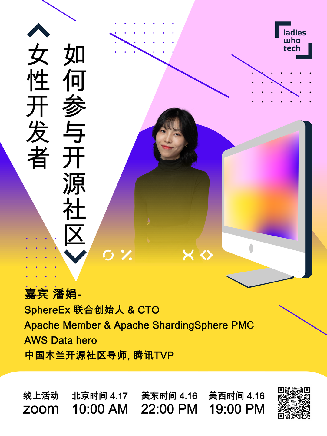 潘娟将于 4 月 16 日、17 日分别出席两场全球女性月系列分享活动,从她作为女性工程师、开源项目核心成员、开源公司 CTO 等角色的真实丰富经验与心路历程,以女性开发者角度为大家分享开源如何为职业发展按下加速键。