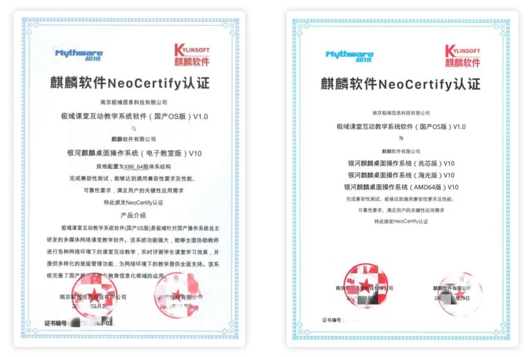 通过前期的功能测试以及在实际课堂教学场景中的应用检测,极域课堂互动教学系统(国产OS版)在银河麒麟桌面操作系统(电子教室版)已经实现80%功能迁移,可100%实现包括屏幕广播、学生演示、网络影院、监看控制、分组讨论、考试评测、文件收发等核心功能,支持单间教室60台以上学生电脑的平稳、安全运行,有效兼容金山WPS、中望CAD等教育软件的同步运行,极域计算机教室智能运维管理系统可有效兼容银河麒麟桌面操作系统(电子教室版),并全面适配飞腾、鲲鹏、龙芯、海光、兆芯等国产处理器平台,可实现智能网络同传和单机系统还原两大功能模块,重点解决网信环境机房的设备快速部署和安全维护问题,最大可支持254台设备纳入管理。