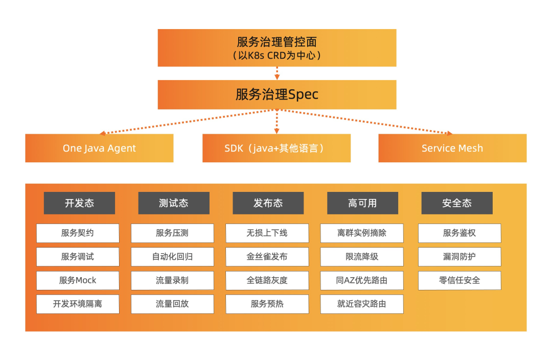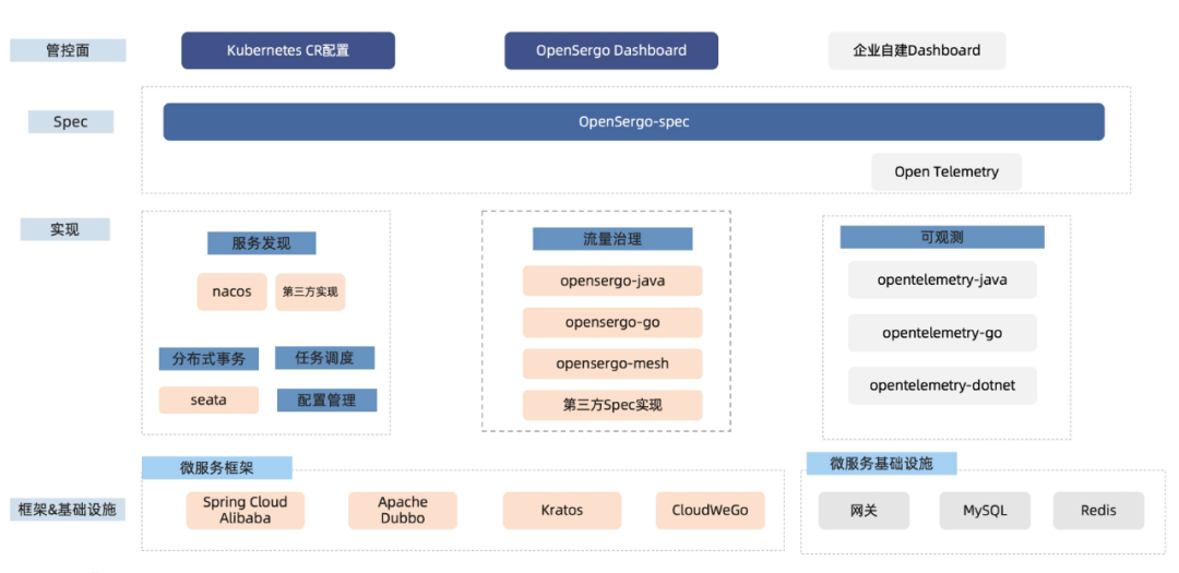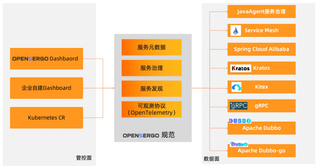 控制面:用户可以通过 CRD 或者 Dashboard 的方式查看、修改服务治理配置,并将这些管控信息下发到数据面。 数据面:JavaAgent、Servcie Mesh、各个接入 OpenSergo 的微服务框架都能够接收到服务治理配置,并应用到当前的业务流量中。各个数据面都能够认可OpenSergo规定的服务治理配置、流量标签等信息,确保降低开发者理解成本。 OpenSergo Spec:Spec 规定了控制面和数据面的通信约定,确保用户使用一种 Spec 即可描述不同框架、不同协议、不同语言的微服务架构,让开发者不再需要关注底层差异。