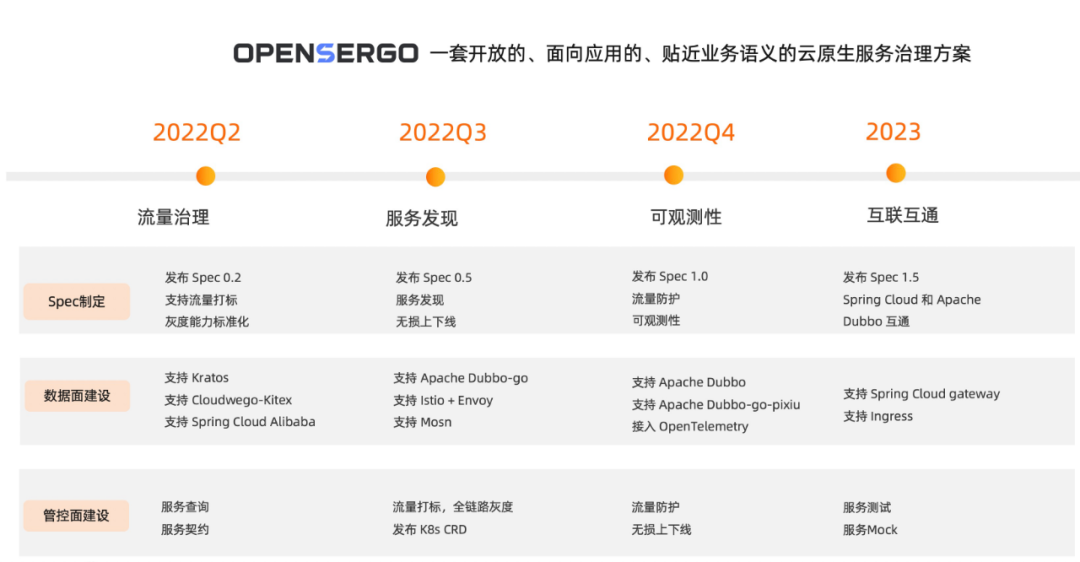 在数据面建设上,OpenSergo 社区将在服务注册与发现、服务治理能力上做进一步补齐,提供统一的服务治理控制面和 Dashboard,招募更多的企业和微服务框架进入社区。同时,我们看到控制面标准化、数据面多样化的趋势,Nginx、Ingress、Apache Dubbo-go-pixiu 等网关作为数据面的流量入口,与 SDK、Java Agent、Sidecar 等多种方式的数据面在能力上能够完全对齐,给更多用户带来简单、一致的、更加云原生的服务治理体验。