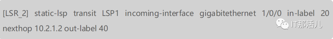 Transit LSR_2上的配置。配置入接口、入标签(20,要与LSR_1的出标签一致)、下一跳和出标签(假设为40)。