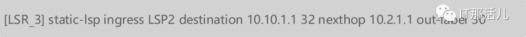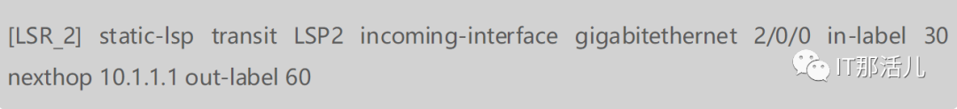 Transit LSR_2上的配置。配置入接口、入标签(30,要与LSR_1的出标签一致)、下一跳和出标签(假设为60)。