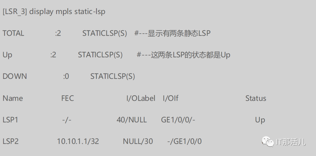 配置完成后,可在各节点执行display mpls static-lsp命令查看静态LSP状态,这里以LSR_3为例。