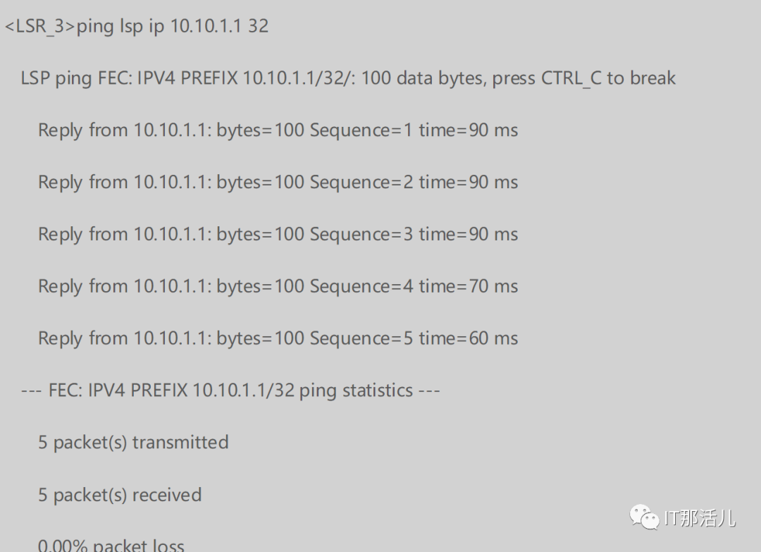 此时,在LSR_3上执行ping lsp ip 10.10.1.1 32命令,Ping到达LSR_1 Loopback1接口IP地址的LSP是通的,测试结果如下所示。