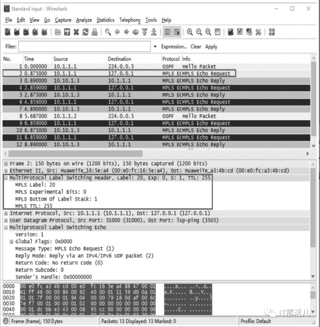 在纯 LSP 隧道(非 MPLS VPN 应用)中,MPLS最多只会带一层MPLS标签。先对LSR_2的G0/0/0端口在LSR_1 ping LSR_3时进行抓包,随便找一个抓取的MPLS报文,均发现其中只有一层MPLS标签(图中的“Mutiprotocol Label Switching Echo”是回显信息,是该MPLS报文的真正数据部分)。