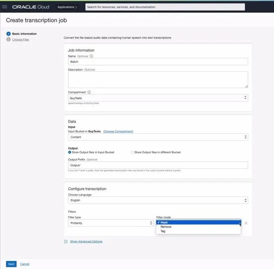 OCI Speech支持进行敏感信息过滤,它可以删除(或全部替换为星号)、屏蔽(用星号替换除第一个字符之外的所有字符)或标记(保留但标记它)输出文本中的敏感信息。