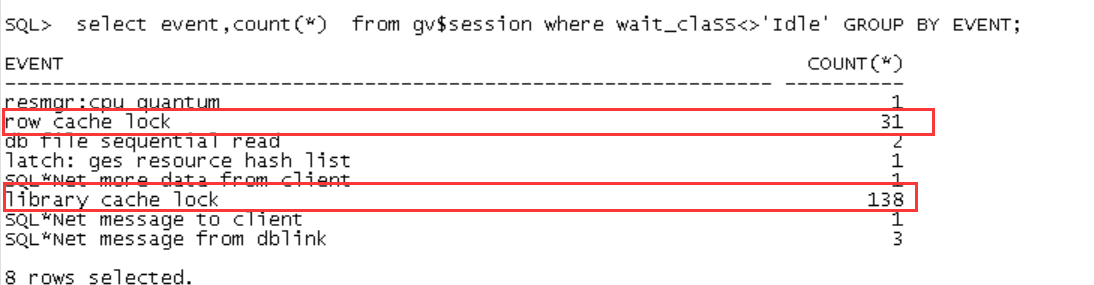 这是我第二次遇到密码修改导致的数据库故障了,于是我让对方提供了向日葵账号,登上去之后查了等待事件,看到大量的library cache lock和row cache lock,修改了event后重启数据库,问题解决。