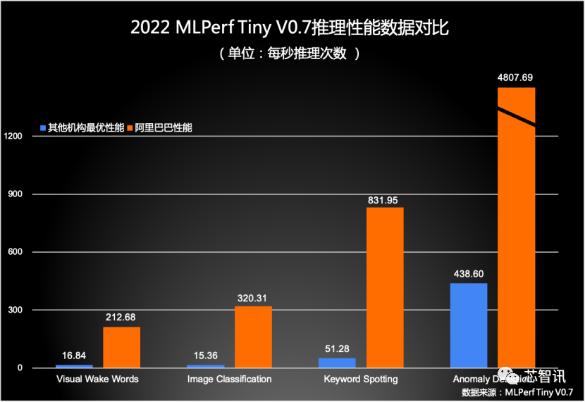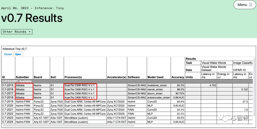 4月7日,全球权威AI基准测试MLPerf发布最新榜单,在聚焦低功耗、高能效的IoT领域Tiny v0.7榜单中,基于平头哥玄铁RISC-V C906处理器的软硬件联合优化方案,取得了全部4个指标的第一,并且达到了其他竞品同类最优性能的10倍以上。这也意味着,玄铁RISC-V C906处理器成为了目前最高能效比的AIoT计算内核。