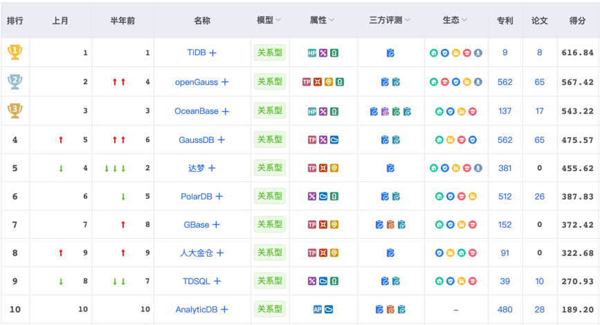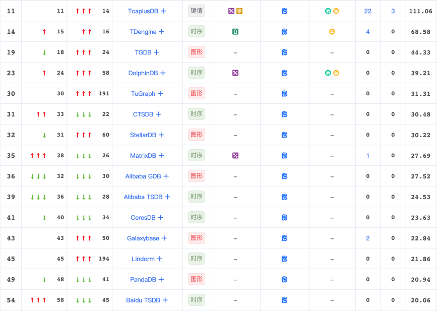 2019年起,墨天轮社区聚焦国产数据库的名录和榜单,通过搜索引擎、趋势指数、三方评测、专利论文、招聘岗位等近50个维度的数据来考察当月国产数据库的流行度,推出中国数据库流行度排榜,每月更新一次,当前已经有205个数据库参与排行。