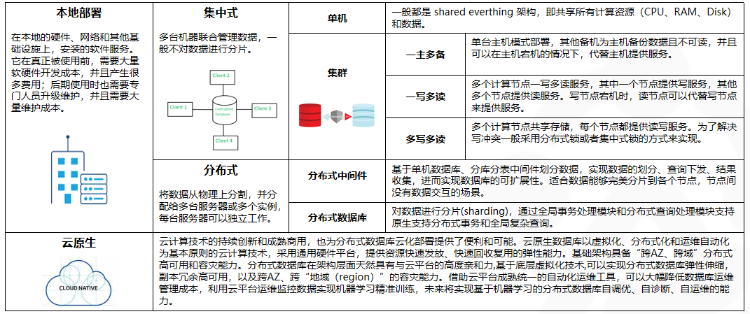 关系型数据库的基础是关系数据模型,由关系数据集、完整性约束规则和关系运算三部分构成。 按业务负载特征进行分类,关系型数据库可分为交易型数据库(OLTP)、分析型数据库(OLAP)和混合负载数据库(HTAP)。当前部署形态主要分为两种,分别是本地部署和云原生数据库。按照架构分类主要有三类:单机、集群、分布式。其中云原生数据库和分布式数据库受到广泛关注,也成为国内数据库厂商重点突破口和主要发力方向。