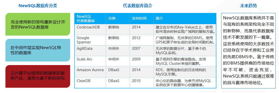 NewSQL是一类现代关系型的DBMS,旨在为NoSQL的OLTP读写负载提供相同的可扩展性能,同时仍然提供事务的ACID保证。简单来讲,NewSQL就是在传统关系型数据库上集成了NoSQL强大的可扩展性。