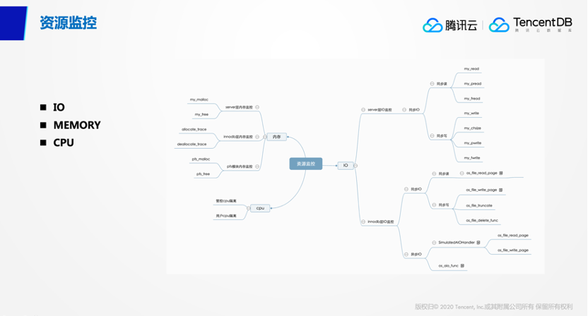 讲师本次分享将从资源管理、查询优化、特定业务场景查询优化三个方面介绍腾讯云数据库自治内容。在数据库服务当中,资源的监控和管理非常重要。只有合理地使用数据库资源,才能提供稳定且高效的数据库服务。数据库服务资源可以分为IO资源、内存资源和CPU资源等。这些资源如果使用不合理,会影响数据库服务。在IO资源方面,例如在执行大事务全表扫描时,IO资源紧张,进而产生IO延迟,从而影响用户的查询体验;在内存资源方面,当有大量用户连接和很多表时,会占用大量内存容易产生OOM。在CPU资源方面,当我们在执行非常多的排序操作,CPU资源负载高,会产生业务抖动,甚至导致实例夯。因此,合理使用资源,才能提供稳定高效的数据库服务。那腾讯云MySQL是如何做资源管理的呢?讲师从内存分配和释放、IO的使用及CPU资源隔离等方面对数据库资源监控进行介绍。