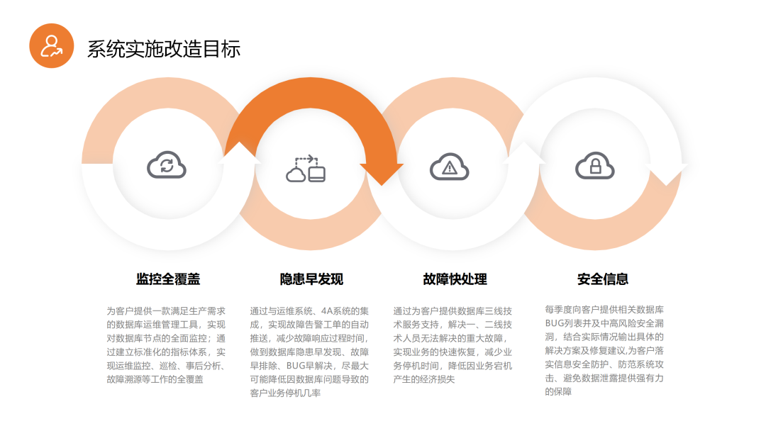 该项目以智能化监控工具为基础,7*24采集分析数据,用较小的代价达到类似全时段覆盖效果。同时借助瀚高在数据库领域的内核研发及自研能力,通过对现有数据库架构体系提出整改建议、响应应用系统开发人员需求等措施,从源头上减少因数据库架构或运行机制引发的数据库服务异常、宕机等情况的发生。