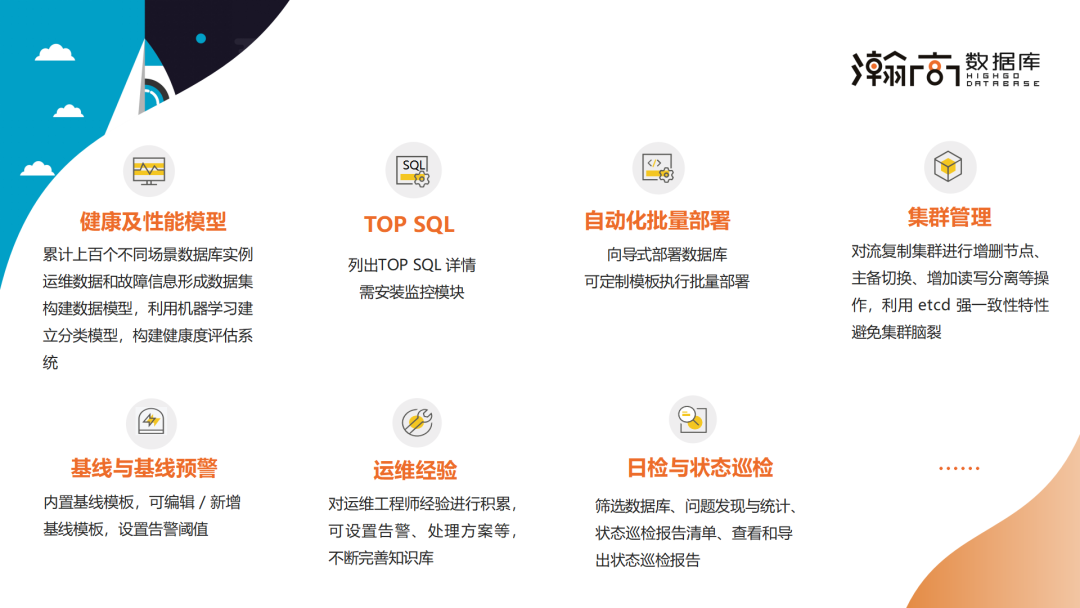 HG-AIOPS:瀚高智能运维管理系统,通过内建的知识库体现其核心价值,能够对采集到的运行指标数据进行自动化、智能化的健康度评估分析,可实现数据库的自动化管理。