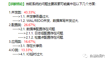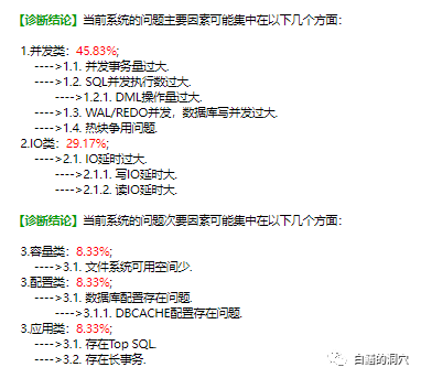 通过这些数据,智能分析算法给出的结论是问题主要集中在并发和IO方面。我们再来看一个在同样压力下的Highgo数据库,这个数据库因为没有等待事件统计数据,因此我们智能采用1秒钟一次的采样来进行分析。