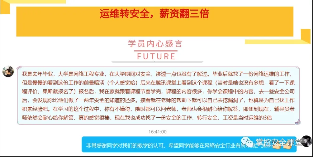 同时网络安全又是信息技术发展中永恒的主题。所以这个行业必然是潜力巨大的行业。自己也做了5年运维工程师了,想趁着还年轻,还有精力,转向一个目前处于蓝海的市场的方向也是一件好事。