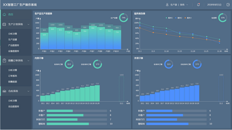 生产操作界面可以展示各个产品生产进度、配件库存、内外贸订单等信息,能够对项目进展,原料库存实时查看,帮助管理者全方位掌控生产车间活动状态,起到监管、维护以及调配多维度统一。