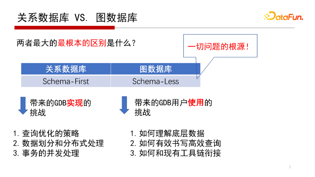在实现方面,即DBMS(数据库管理系统)内核实现层面。传统关系数据库RDBMS的很多查询优化策略(即查询引擎的执行策略)、数据划分和分布式的处理,以及事务的并发处理都是定义在表结构上的,因此关系数据库的很多技术是依赖于Schema的;而在图数据库中,因为没有像关系数据库一样的Schema,相关的技术都需要重新考虑。这是从实现角度带来的数据库系统DBMS本身带来的技术挑战。
