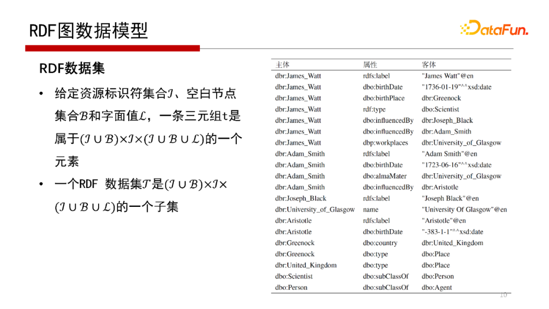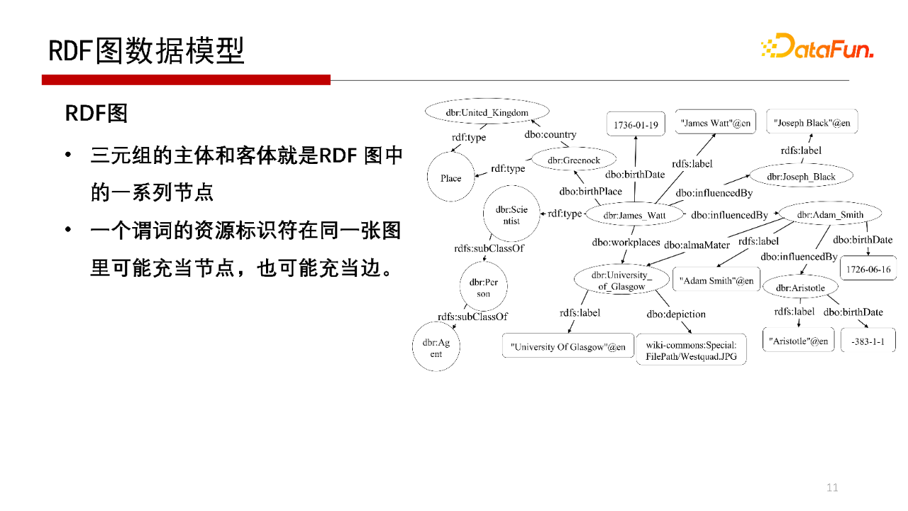 这两个模型孰优孰劣,现在还不是很好讨论,因为两个模型各有各的优劣。例如,语义网特点是比较容易支持后期的推理,而且其标准化做得比较好。而目前图数据库也正在做标准化的事情。评判两个模型的优劣也不应该仅从技术角度做评判,因此认为还不是评判的时候。下面我们简单介绍一下相关模型。