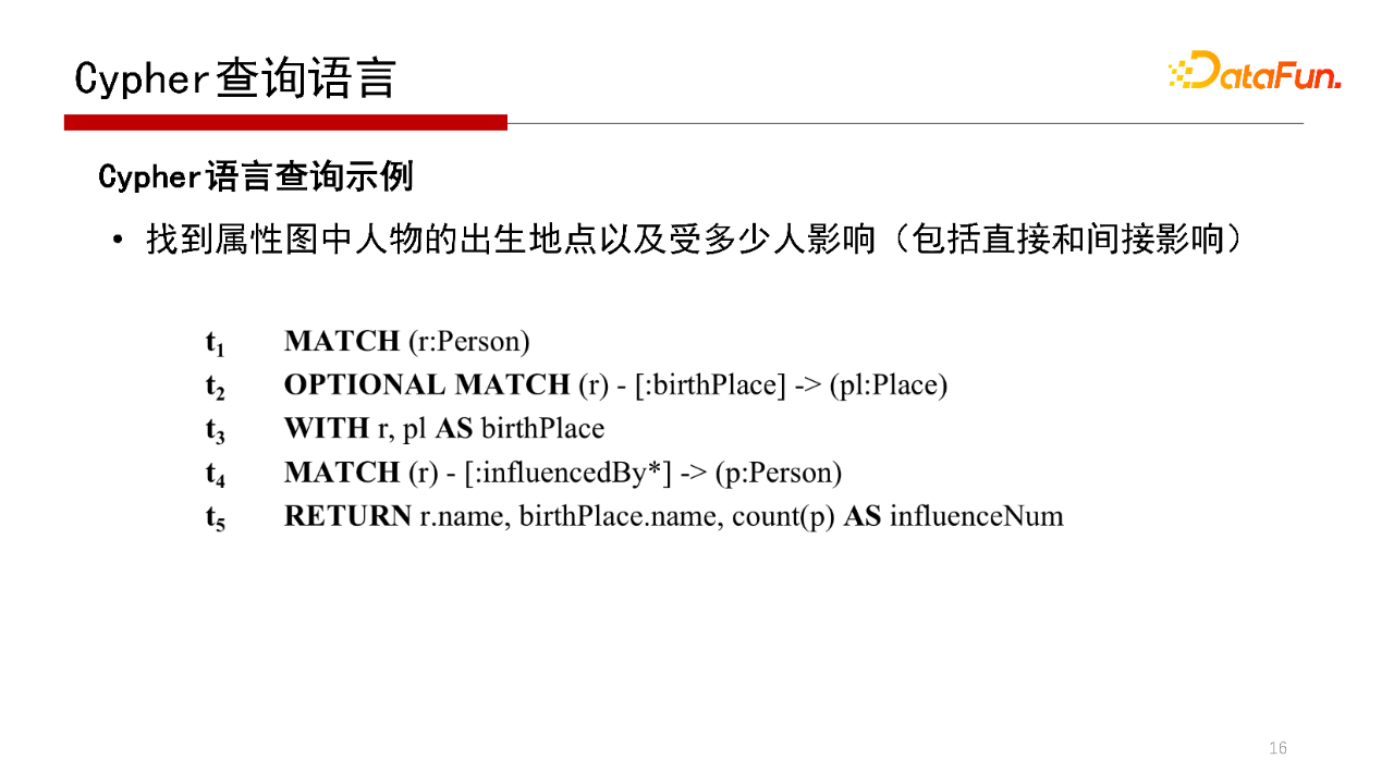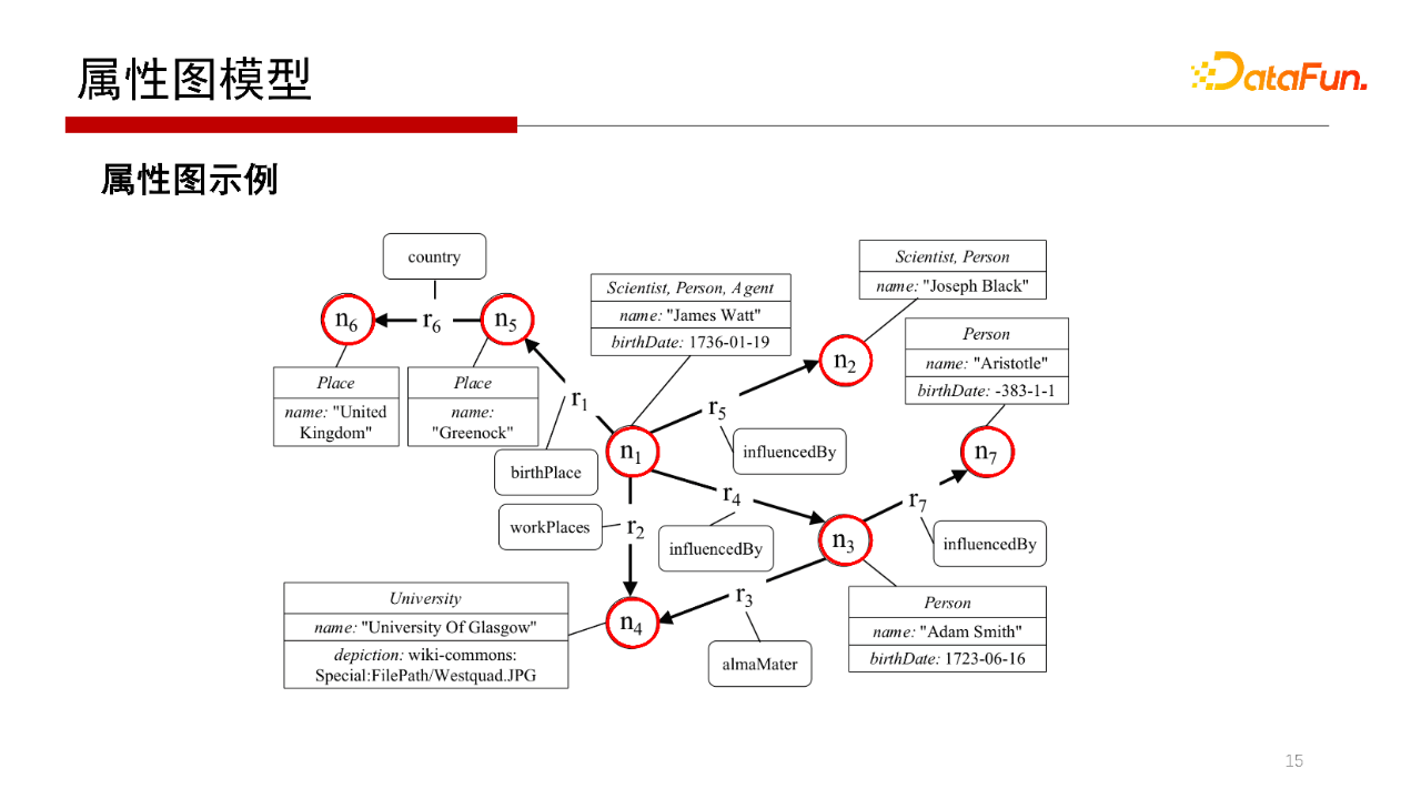 属性图如之前所讲,其点和边都是有属性表的,如Person,Person的名字name、Person的birthDate;如边r7上目前只画了标签influencedBy,但实际也可以是属性表的。这是属性图的一个非常好的优势。