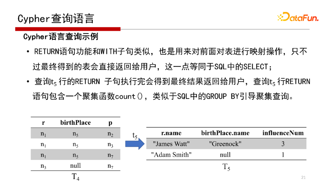 对于Cypher查询语言也是一个子图匹配。如上图中OPTIONAL MATCH和MATCH语句,其可以表现为上图中左下角的Q,在匹配右侧G时,“birthPlace”是匹配到节点的属性值上去了,仅此而已,其实也是一个子图匹配的过程。