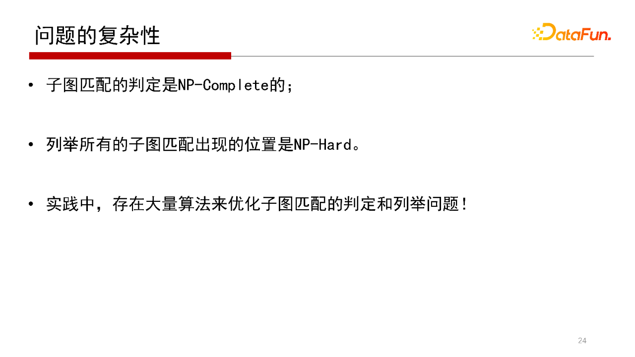 从计算复杂性来讲,子图匹配是一个非常复杂的问题。如果对查询图Q不加限制,子图匹配的判定是NP-Complete的;列举所有的子图匹配出现的位置是NP-Hard。虽然匹配算法本身是指数的,但在实践中,可以采用大量的过滤策略来检索搜索空间,从而提高查询的性能。
