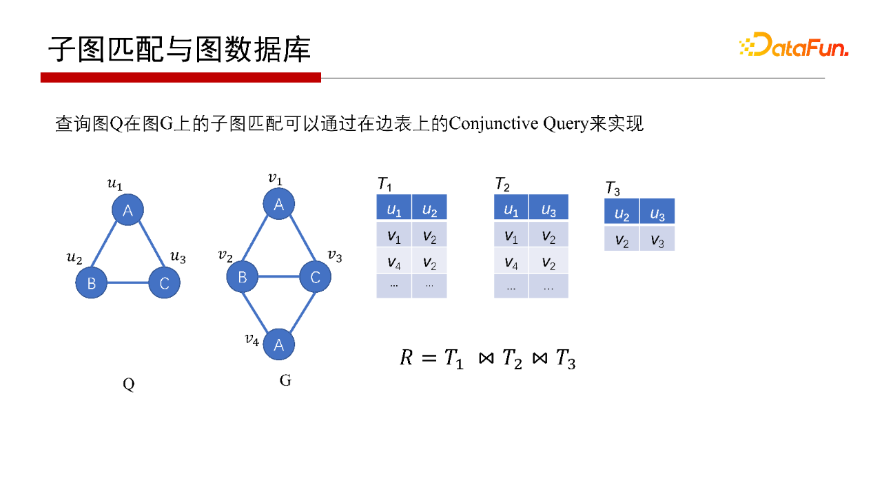 那子图匹配如何解呢?子图匹配问题用关系数据库也可以解。如上图G存在边表里,表示边的起点和终点。回答Q在G中的子图匹配查询,则分别先找到匹配查询图Q中的AB边的是T1表、匹配AC边的是T2表和匹配BC边的是T3表,然后T1、T2、T3做自然连接(Join)操作,如果结构非空,就找到Q的子图匹配了。所以,如果用关系代数来解决子图匹配的问题,则等同于关系数据库的Conjunctive Query。
