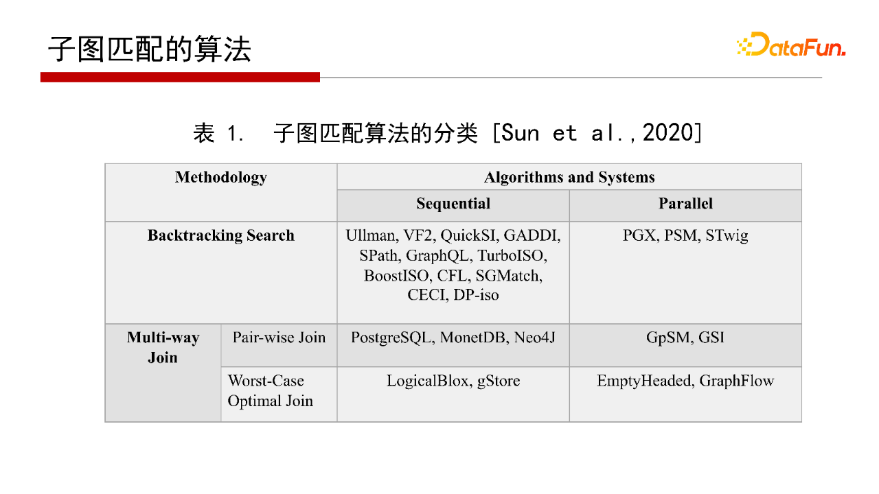 在一篇SIGMOD 2020实验论文中指出,做子图匹配可以有两类算法,一类为基于深度搜索加回溯的方式(Backtracking Search),一类为基于广度优先的Multi-way Join方法。