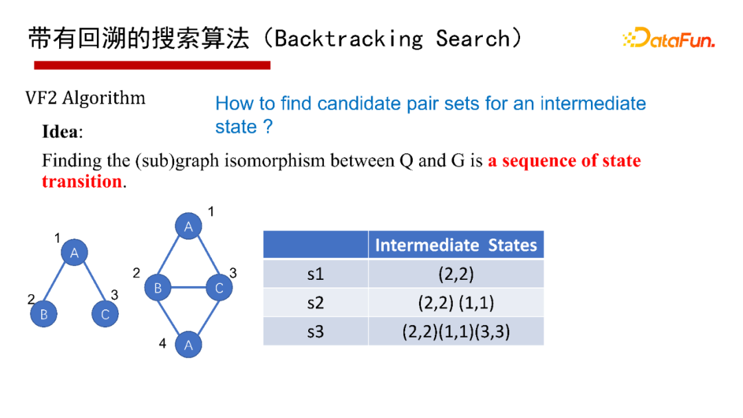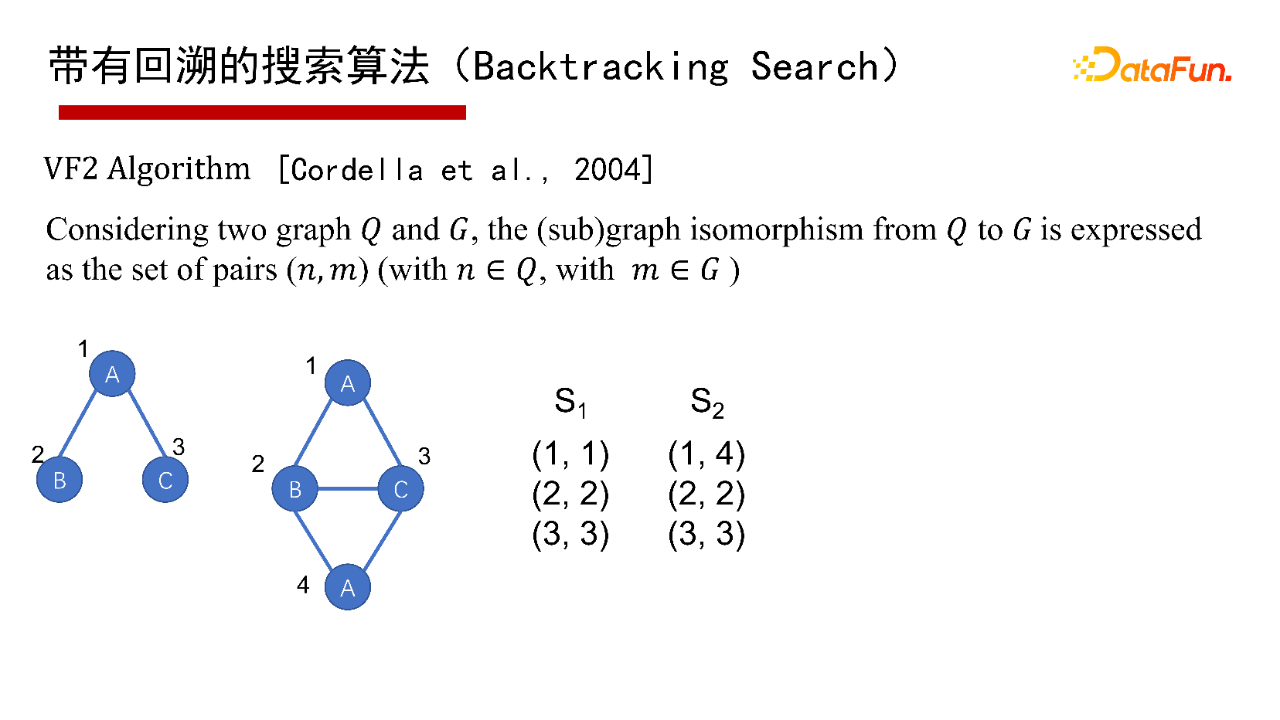 带有回溯的搜索算法(Backtracking Search),有1976年最早开始的Ullmann算法,2000年的Ullmann Algorithm算法,2004年的VF2 Algorithm算法等,这里就不再具体介绍算法本身了,有兴趣的同学们可以参考给出的参考文献。