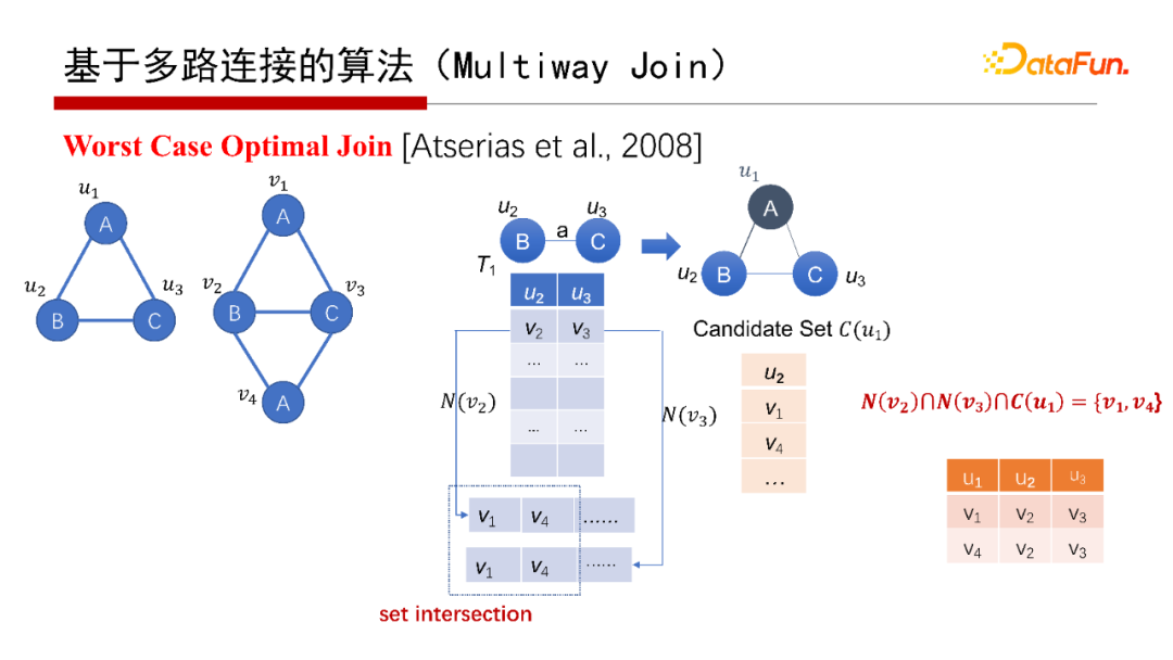 还有一种是Worst Case Optimal Join(具体可以查看给出的参考文献)。例如,假设已经匹配了BC这条边,即G中的v2和v3匹配了Q中的u2和u3,那么要找查询图Q的ABC的匹配,则查找G中是否有一个三角形恰好能够匹配Q的ABC,并且三角形包含v2和v3。例如考虑中间结果表的第一行,把v2和v3的邻居N(v2)和N(v3)找出来,然后两个集合做一个交集set intersection,再和A点的候选集合C(u1)做个交集,N(v2)、N(v3)、C(u1)三个集合的交集不为空,在这个例子中交集为{ v1, v4};将其分别串联到v2和v3后面,得到v1、v2、v3和v4、v2、v3这两个匹配。在上面的例子中,可以对每一行都执行该操作,因此该算法很容易做并行。