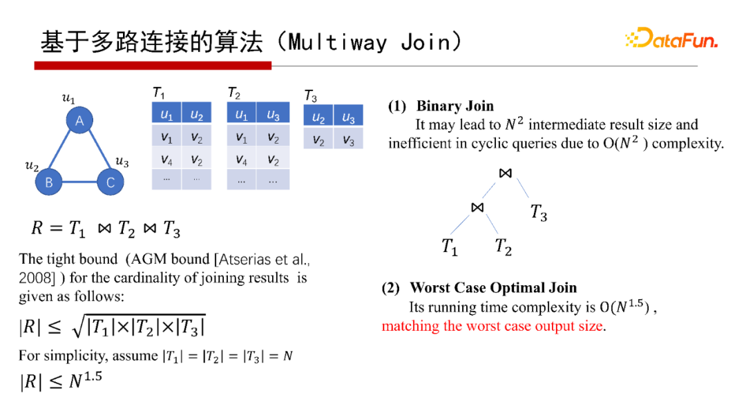 对于宽度优先的算法,实际关系数据库每次的Join就是宽度优先。子图匹配从逻辑来说是T1、T2、T3的Join操作。Join怎么执行呢?从Join执行角度来说,有两种不同的执行方案,一种是Binary Join,即第一张表T1和第二张表T2作Join,结果再与第三张表T3作一次Join,是以边为中心。