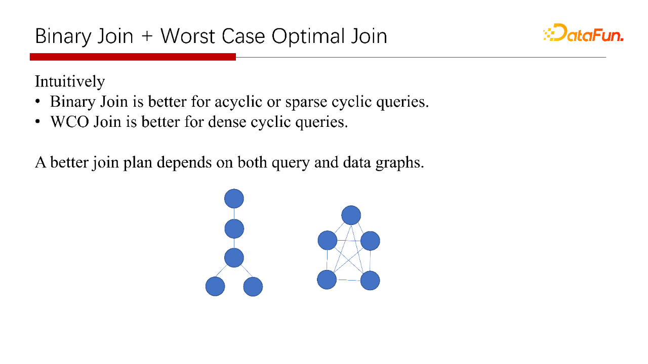 启发式地讲,Worst Case Optimal Join和Binary Join各有好处。Binary Join比较适合没有环或者是树形或者环比较稀少的查询图。Worst Case Optimal Join比较适合密集环形的查询图。因此,比较好的Join方法是依赖于查询图的图结构。