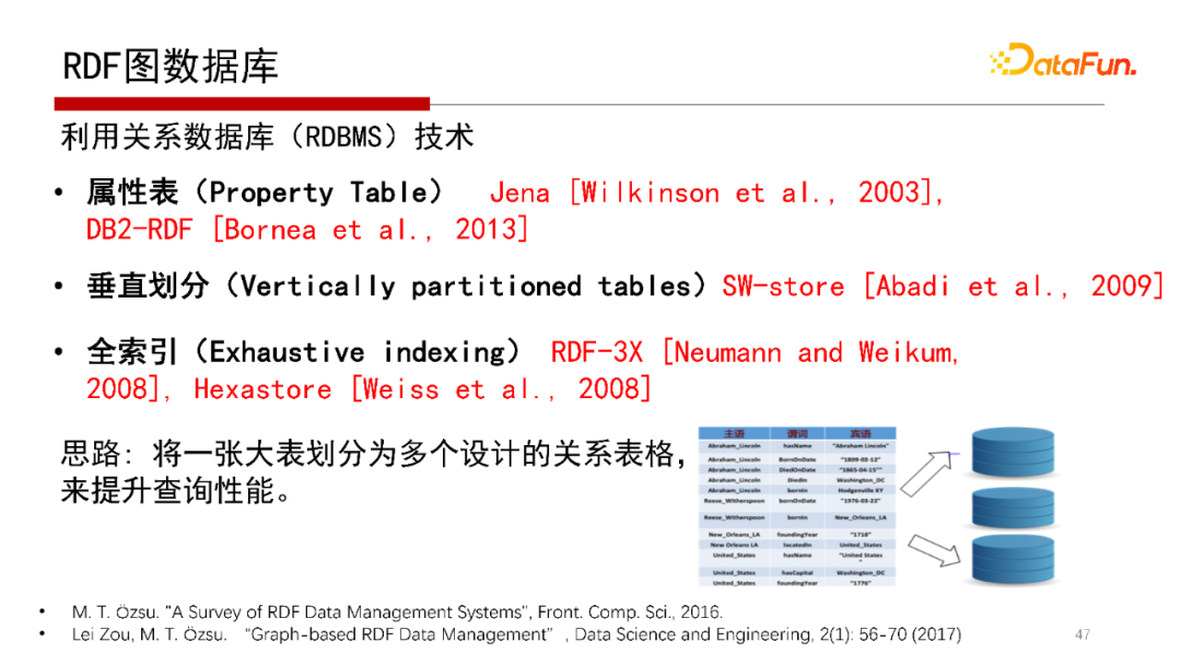 然后用SQL语句去执行,或者可以把一张大表的表结构划分成不同的表,仍然采用转化成SQL语句,类似关系数据库一样去查询,如Oracle、DB2最新的版本支持RDF,就是用这种方法去做的。但该方法的Join会很多,性能会非常低。