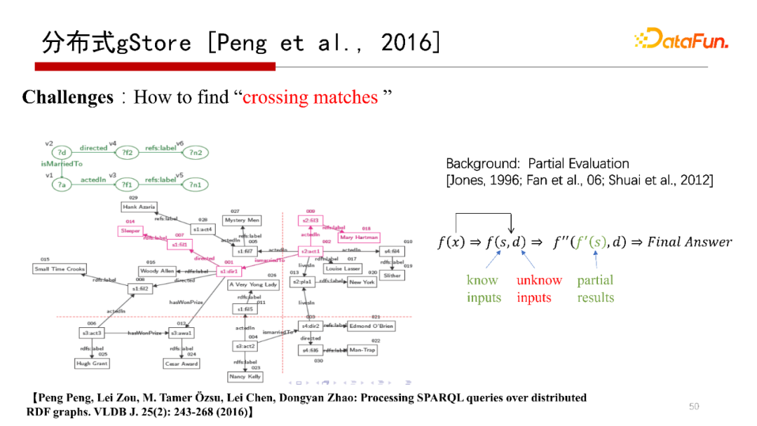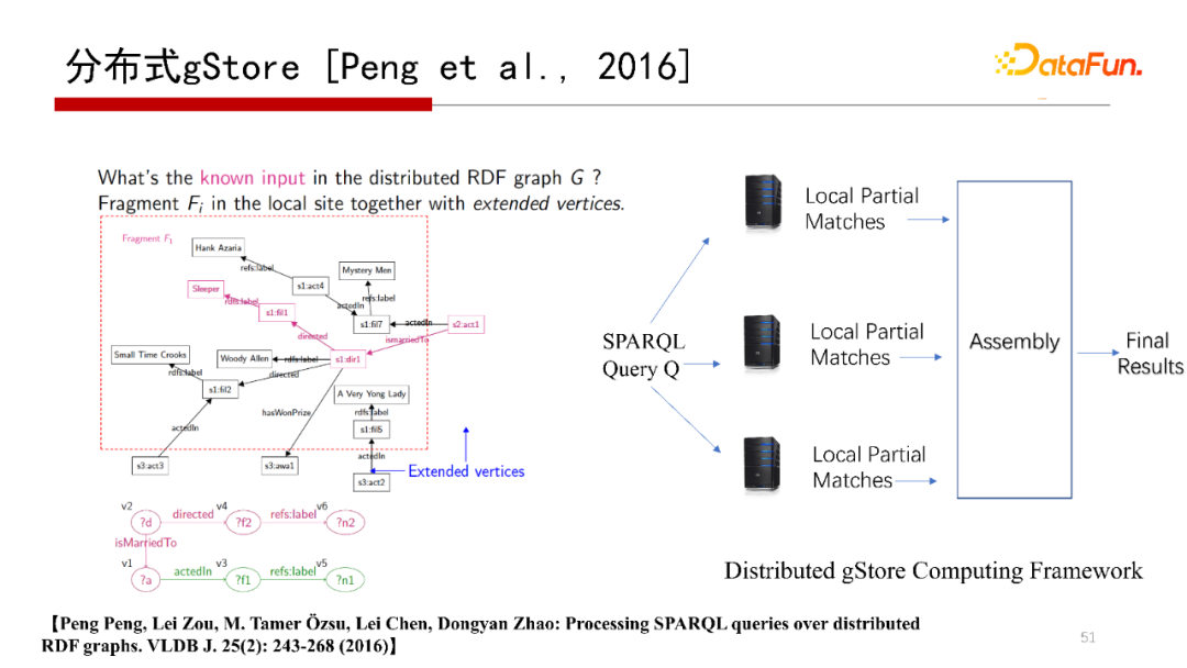 下面提到的是分布式gStore系统,解决的是单机存储不下一个大的RDF图,需要分布式存储在多个机器上,而查询结果跨在多台机器上的问题。我们在VLDB Journal 2016的一篇文章“Processing SPARQL queries over distributed RDF graphs”有介绍分布式gStore。