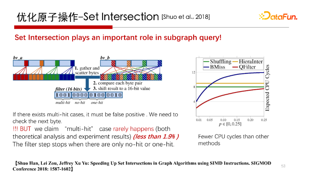 我们在2018年SIGMOD上面发表的“Speeding Up Set Intersections in Graph Algorithms using SIMD Instructions”文中,提出了一种利用 CPU 的 SIMD(单指令多数据流)向量计算方法,通过设计一种精巧的数据布局(Data Layout)策略,可以降低对集合求交中CPU运行的Cycles的数目。