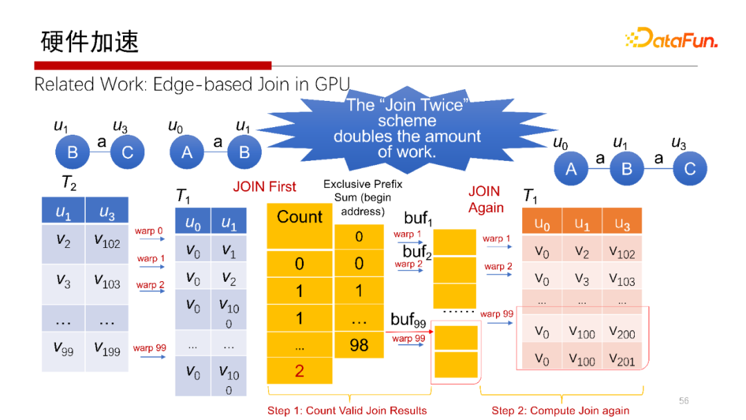 刚才提到,Worst Case Optimal Join算法,每一行是完全独立的查询操作,非常容易做并行。所以会想到使用在GPU上运行操作。但在GPU上执行操作,其每个线程或每个wrap做计算没有问题,但中间结果如何写回去,如何避免写冲突是需要考虑的。我们提出一种方案使得每一个wrap独立地去执行,并且可以独立地去写,在不需要加锁的方式下不会产生写冲突。