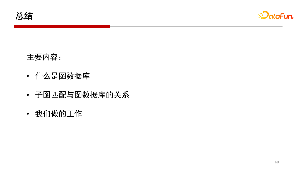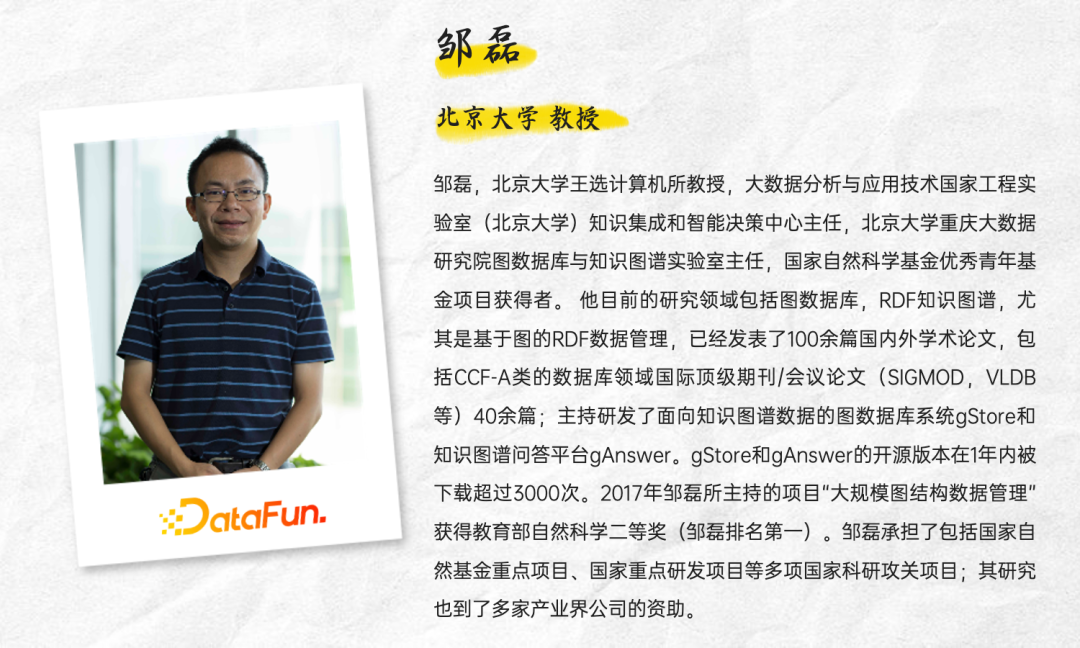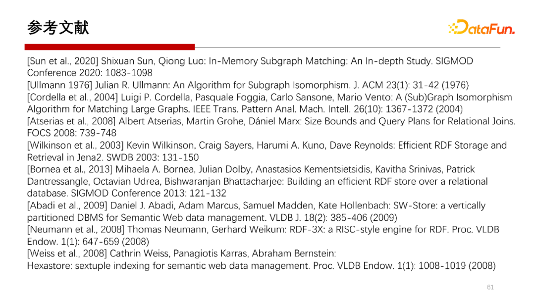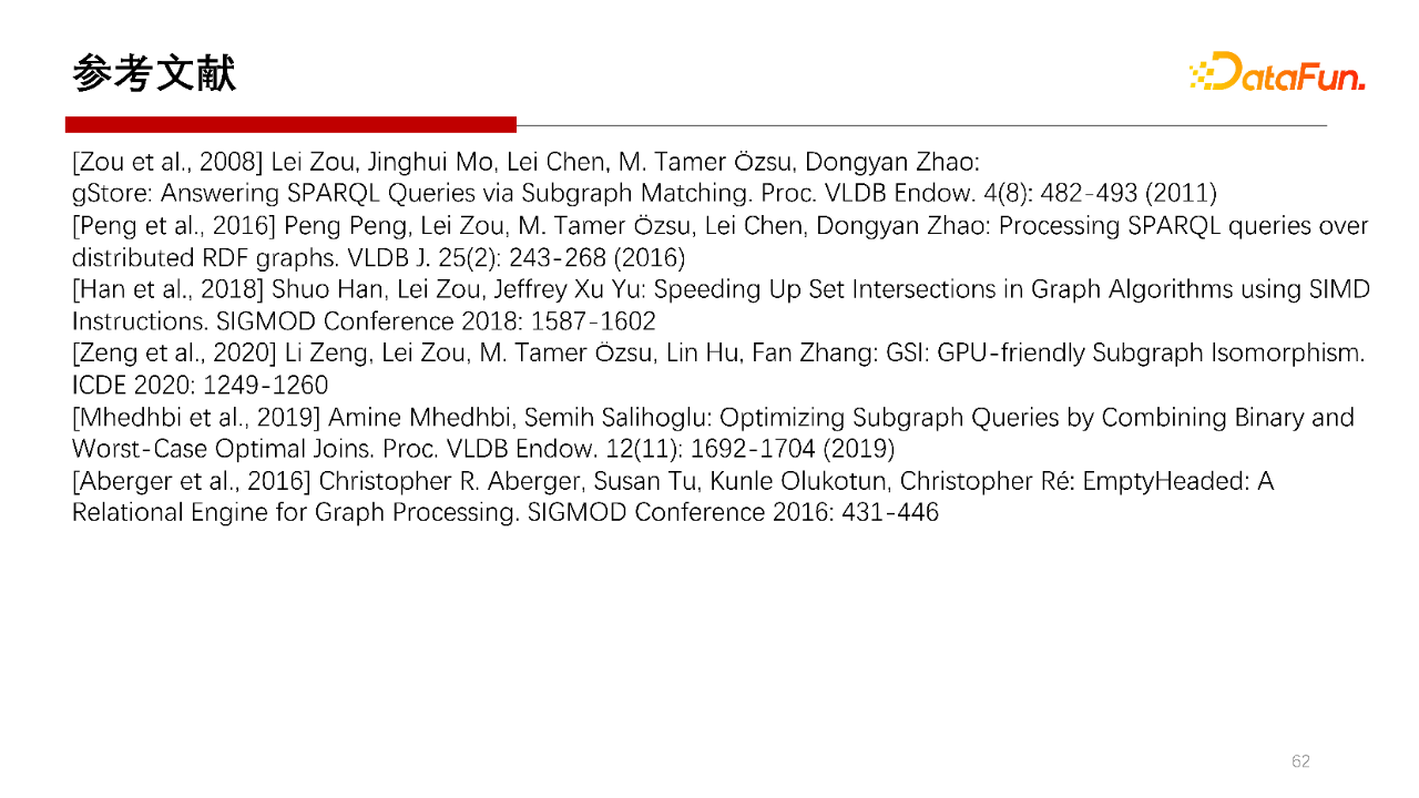 最后,总结一下:首先介绍了什么是图数据库以及我们对图数据库的一些思考;第二个重点关注查询引擎组件的工作,子图匹配和查询引擎之间的关系;第三个是对我们北京大学数据管理实验室(PKUMOD)的相关研究工作的介绍。