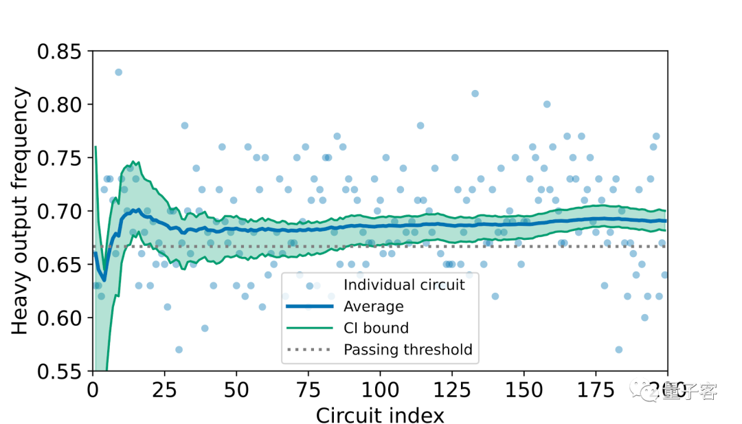 图(2)显示了量子体积4096测试中每个量子线路的单个重输出概率。蓝线是累积的平均重度输出概率,绿色区域是用新方法计算的累积的两西格玛置信区间。