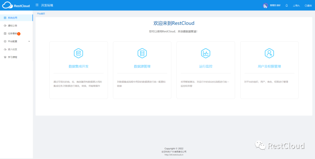 RestCloud ETL社区版是一款完全国产化自主研发创新的全WEB化、开箱即用、永久免费的数据集成工具,提供可视化的数据管道搭建、数据源管理、运行监控及权限管理等功能,其定位为业务人员即可使用的数据集成工具。