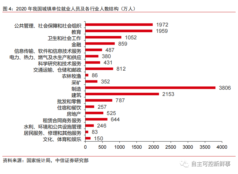 2)大口径5563万人:政府机关+事业单位(含教育、卫生等,不含央国企。)根据国家统计局,2020年我国国有单位就业人员共5563万人,此口径以政府机关、事业单位为主。