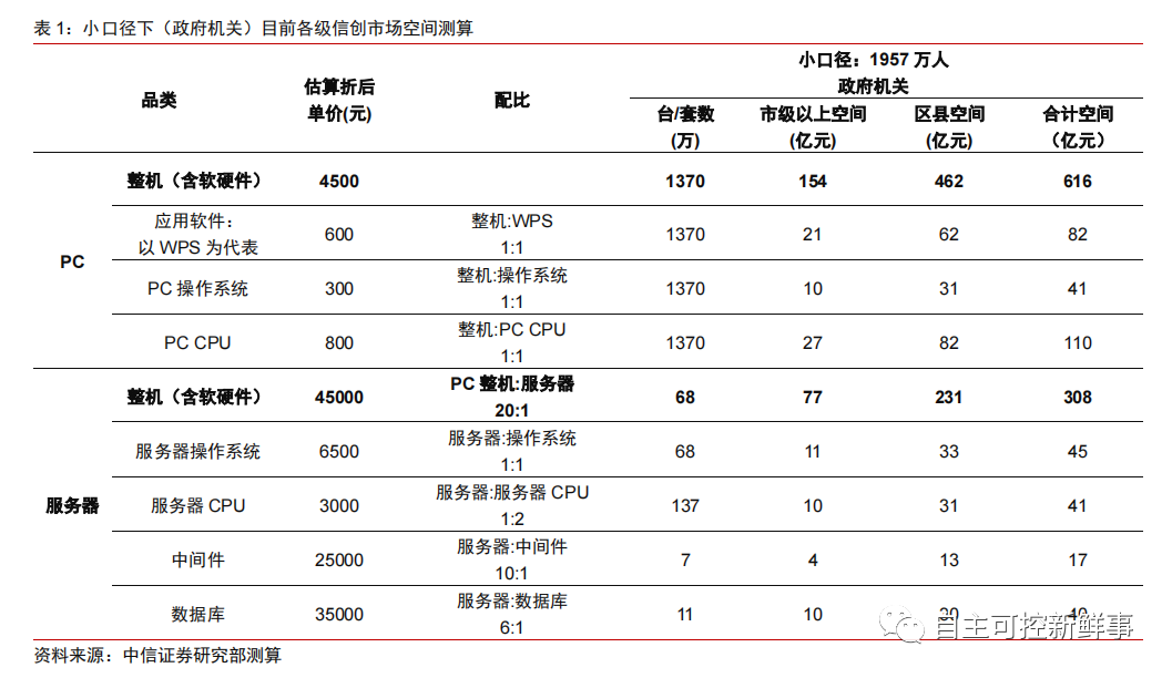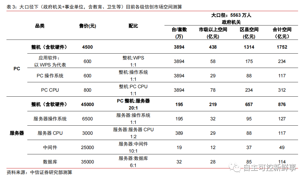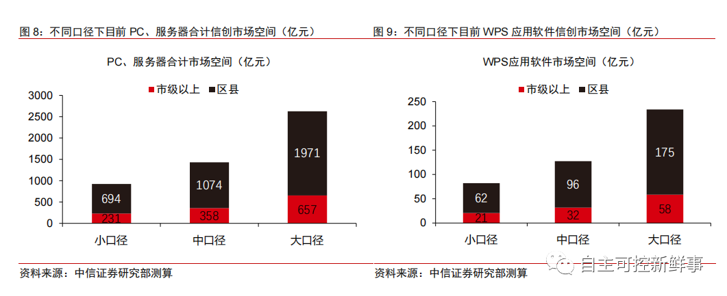 大口径(政府机关+事业单位,含教育、卫生等):PC、服务器 3894 万、195 万台,合计对应 2628 亿信创市场空间,其中区县市场 1971 亿元。