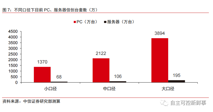 1)合计:我们测算小口径共 1957 万人,目前对应 PC、服务器台数分别为 1370 万、68 万,PC、服务器(含软硬件)合计市场空间达 924 亿元,其中 PC 616 亿元、服务器308 亿元。