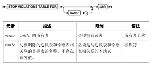 使用 STOP VIOLATIONS TABLE 语句来删除目标表、它的违反表与它的诊断表之间的关联。此语