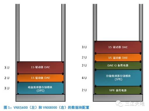 • VNX5200、VNX5400、VNX5600、VNX5800 和 VNX7600 的 3U DPE(磁盘处理器存储模块)或 VNX8000 的 4U SPE(存储处理器存储模块),以及至少一个用于存储区驱动器的 DAE。