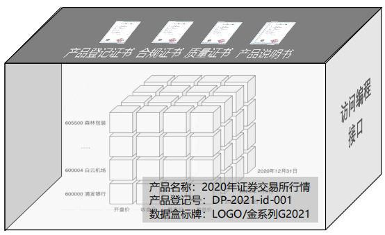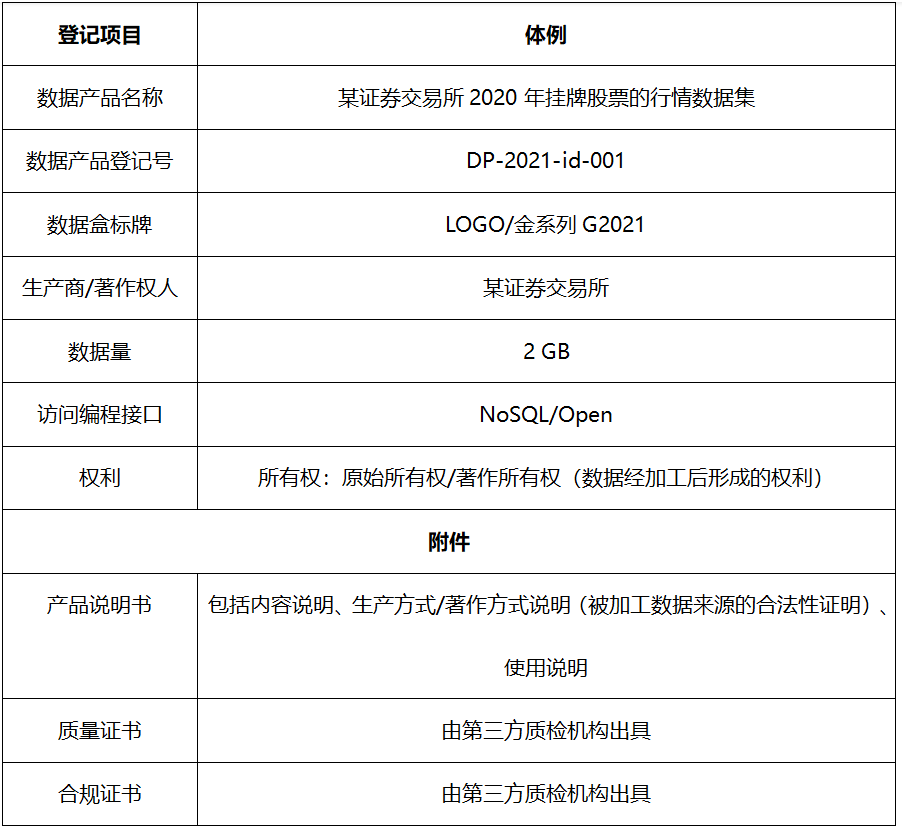 图1 “某证券交易所2020年挂牌股票的行情数据集”盒装数据产品(2)盒外包装包括产品登记证书,以及产品说明书、质量证书、合规证书等内容。①盒装数据产品登记证书是拥有者对相关数据产品权属的声明,是对盒内数据的概述性介绍,由专门的数据产品登记主管部门审核发放。只有登记后的盒装数据产品才具有合法性,才被允许在数据市场上进行流通和交易,并受法律保护。盒装数据产品登记证书主要包含产品名称、产品登记号、数据盒标牌等内容,以及产品说明书、质量证书、合规证书等附件(表1)。②产品说明书包括数据产品内容说明、生产方式/著作方式说明(被加工数据来源的合法性证明)和使用说明等。③盒装数据的质量证书就是盒装数据中的数据集达到相应质量标准和要求的证明性文件,是其开展交易流通的重要凭证。质量证书的相关内容可以作为判断盒装数据价值高低的依据。④盒内数据必须合法合规,即符合国家相关法律规定。盒装数据的合规证书主要用于承诺盒内数据符合《数据安全法》《网络安全法》《个人信息保护法》等国家有关法律要求。