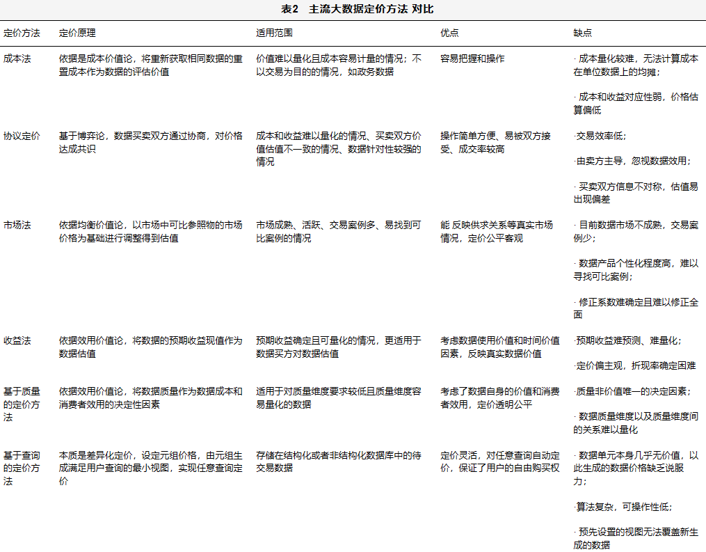 随着各行各业对数据需求的日益增长,越来越多的数据产品在网上交易,人们对数据的需求也越来越多样化。数据市场活跃不仅能缓解“数据孤岛”现象,还能发挥规模经济效应,释放更大的价值。在DaaS定价的基础上,研究者提出了一些新兴的数据产品定价方法,分为以下两大类。基于版本的定价是基于数据垄断者实施的价格歧视策略,营利性和交易效率较高。数据产品版本的划分依据可以是数据特征或用户需求,两者均能实现市场细分、增加利润。如广联达科技股份有限公司将其推行的软件划分为低价的学习版和高价的专业版,这便是对不同用户群体实施的价格歧视策略。此外,数据的低复制成本和买方异质性使得捆绑定价应用普遍,如将不同数据质量的商品进行捆绑,以获取更高的利润。为了实现进一步的市场细分,Balazinska M等人将数据版本看作视图,按用户选择的任意组合的视图来分配一个价格。此后,Koutris P等人将基于版本的定价进行了扩展,提出了基于查询的定价模式,通过预设视图价格实现了对买方任意查询的自动定价,避免了套利和折扣。Li C等人进一步提出线性聚合交互式查询定价模式,该模式满足无套利、非披露、无后悔3个属性。为了突破上述基于查询的定价中只能通过预定义视图查询数据这一限制,Li C等人开发了一个基于扰动查询的定价模型,并建立了更加灵活的无套利定价函数。而TANG R M等人则为元组设定价格,由元组生成满足用户查询最小的视图,从而为任意查询定价。但此改进后的基于查询的定价仍存在诸多障碍。首先,单个元组本身几乎无价值,以此组合而成的数据价格无说服力;其次,如何选择视图并对其进行定价缺乏明确的方法,从而造成实际操作中的障碍;最后,该模型是离线交易模型,而数据的更新是迅速的,预设价格视图无法覆盖新生成的数据。基于效用的定价即基于数据自身属性和效用对其进行定价。前文定价多由卖方主导,强调供应商的利润,缺乏对数据效用的考虑。鉴于此,Heckman J R等人和Harmon R等人分别基于数据的内在价值和客户感知价值建立了数据定价模型,均强调了定价时对用户利益的考虑。Liang F等人指出基于客户支付意愿的定价有利于供应商更长远的利益,关键在于如何对此意愿进行量化。而数据质量的高低通常决定了用户的支付意愿,因此质量因素常被用作数据效用的度量标准。数据质量维度之间存在线性和集成两种关系,线性关系表示各质量维度对数据质量的独立影响,集成关系表示数据质量维度之间的相互影响。基于数据质量的定价考虑了数据本身的价值和消费者效用,公平且透明,但仍然存在一些不足。首先,它只考虑了质量因素,忽略了数据容量等其他重要因素;其次,数据质量维度及维度之间的关系是难以量化的。3 国内数据定价方法研究现状